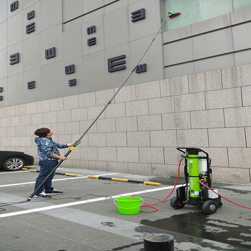 學校內(nèi),多為低樓層建筑,高度普遍在20米以下。此高度的建筑外墻、玻璃外墻、連廊的清潔,處于較為尷尬的境地。搭建腳手架登高進行清潔,員工的人身安全得不到保障,危險系數(shù)明顯上升,員工的工作積極性低。外包專業(yè)的高空清潔作業(yè)團隊,每年兩次清潔,投入費用過高。意大利IPC高空清潔機,能夠解決20米以下低高空外墻清潔的難題,設備自帶的四級過濾系統(tǒng),將水中的總?cè)芙夤腆w含量低,充分提高水的潔凈力,配合伸縮桿或快裝桿,其清潔高度可達20米,且清洗過后的作業(yè)表面自然風干沒有水漬。無需登高作業(yè),既充分保障了安全性,又能完成清潔作業(yè)任務。