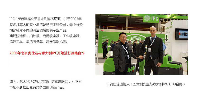 )成立于2001年,是國(guó)內(nèi)較早進(jìn)口清潔設(shè)備服務(wù)商之一,二十年發(fā)展中,已然成為三大國(guó)際品牌代理,分別意大利IPC清潔設(shè)備,意大利KEVAC工業(yè)吸塵器,德國(guó)WEIDINER高壓清洗機(jī),為了解決各種不同的環(huán)境清潔問(wèn)題,奧仕潔目前整合了國(guó)內(nèi)外知名廠(chǎng)商的商業(yè)清潔設(shè)備、工業(yè)清洗設(shè)備、清潔藥劑、高空升降設(shè)備等系列清潔服務(wù)類(lèi)設(shè)備,專(zhuān)業(yè)提供一站式清潔系統(tǒng)解決方案。